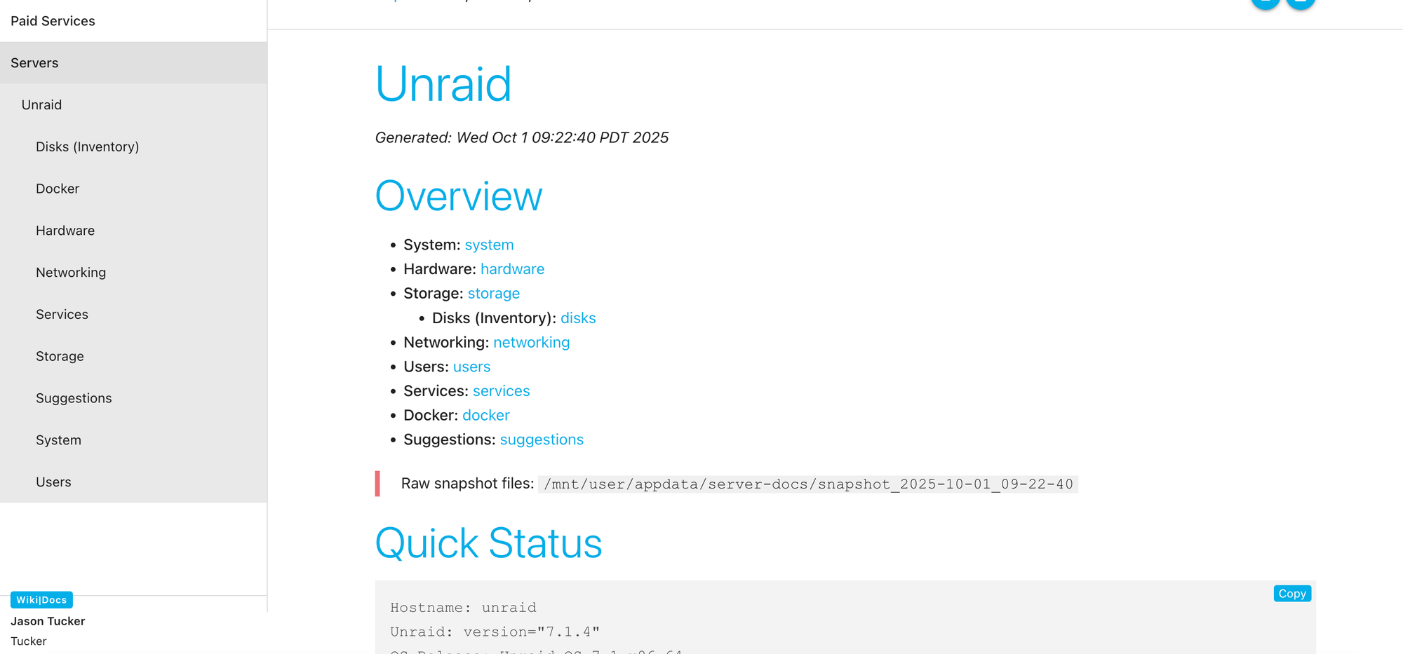 Build a WikiDocs snapshot of an Unraid server dynamically