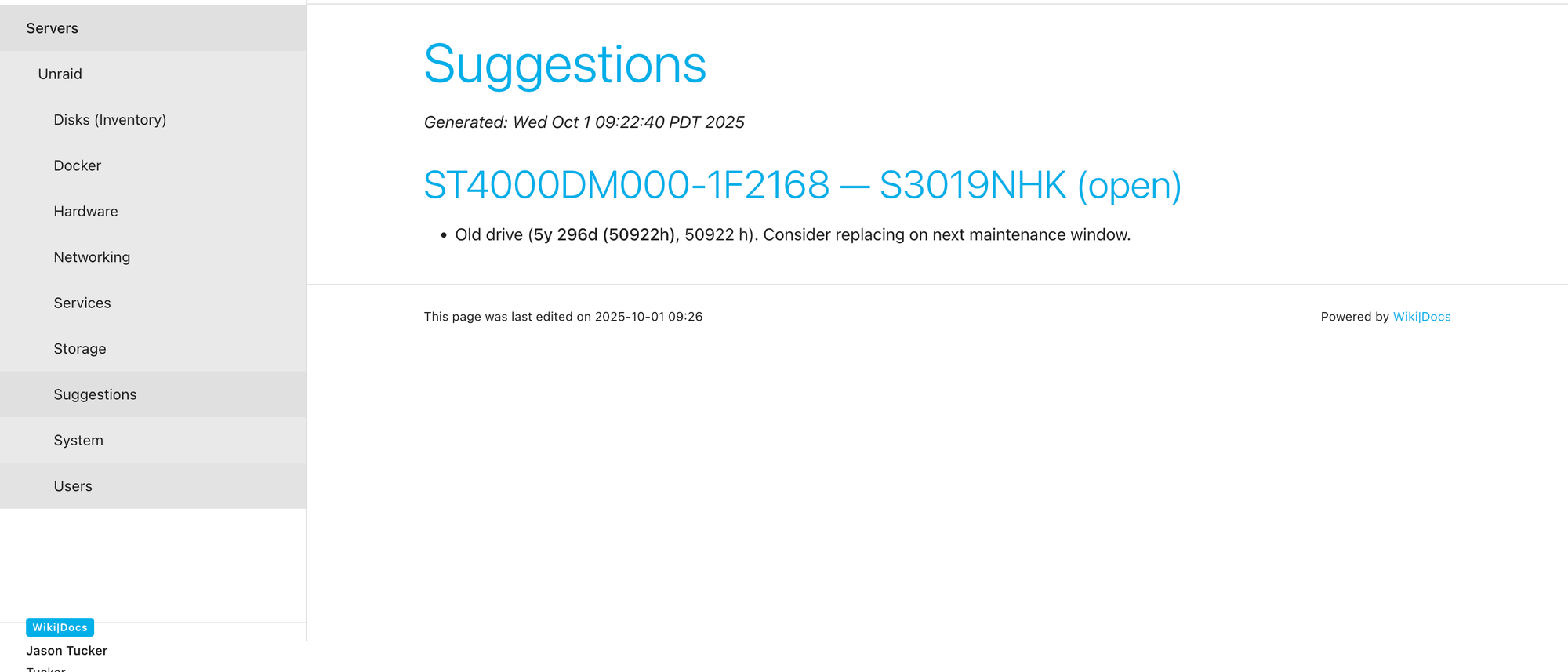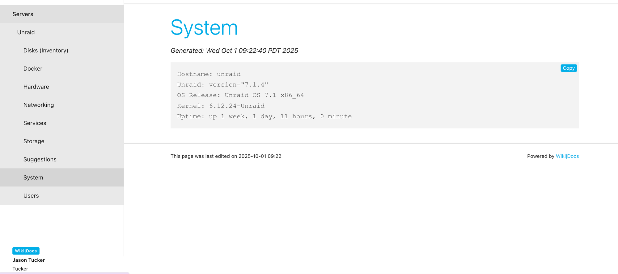 How I built a script that snapshots my Unraid box (hardware, disks, shares, Docker, etc.) and publishes it as pretty Markdown pages in WikiDocs.
