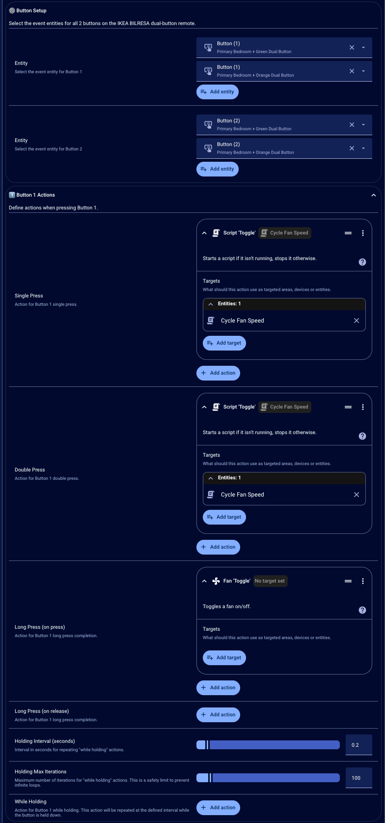 To use this remote to its fullest in Home Assistant the easiest way to do it is to use this Blueprint for Ikea Bilresa Dual Button Remote that has all the button presses setup. I went to that site and clicked the import blueprint button and added it to my home assistant. From there selected the 2 buttons I wanted to configure and got things working using the Cycle Fan Speed script to do the speed toggling and toggle light to do the light toggling. Since you have 3 states per you can set those up how every you like. Also if you have 2 sets of buttons (I have a green and an orange one on either side of the bed) you can configure them together like I did here.