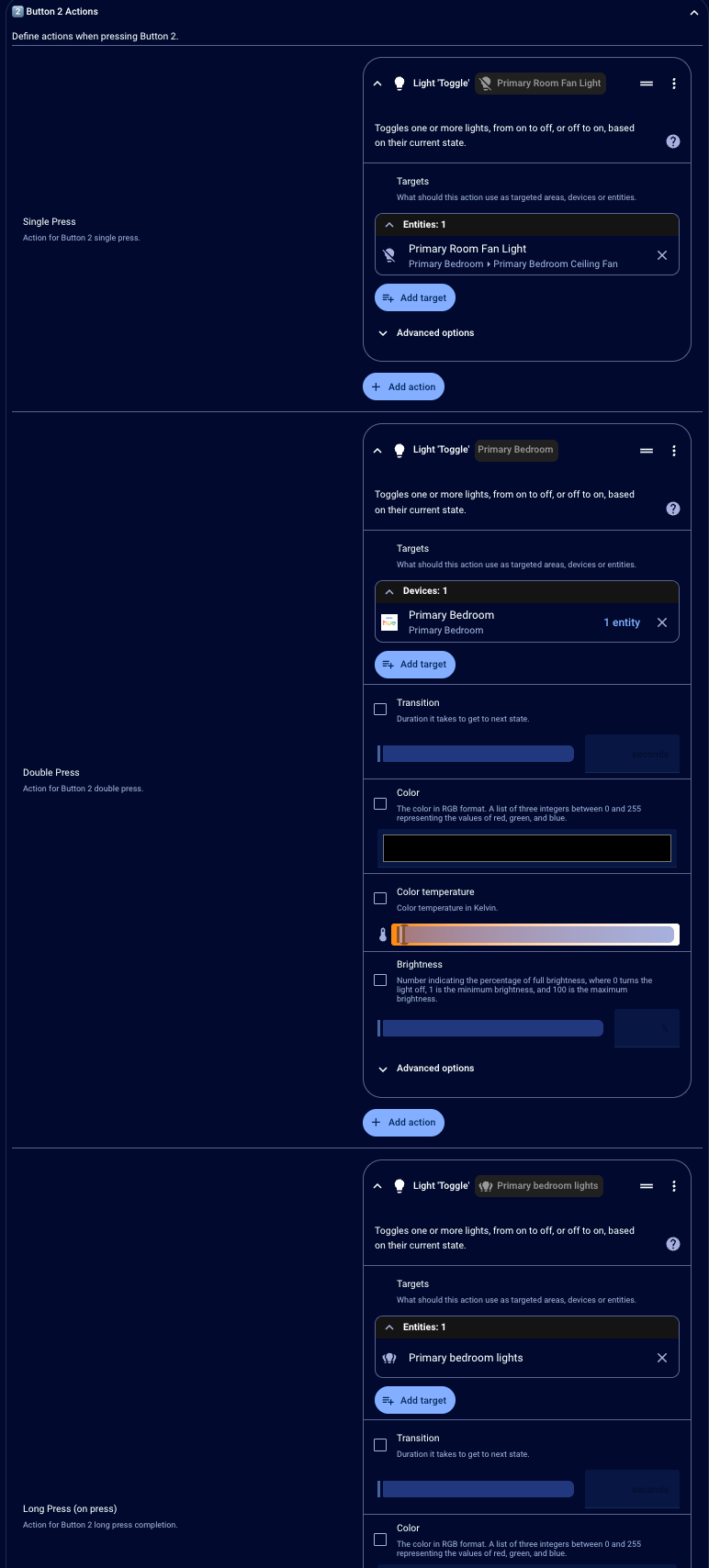 This remote is kinda awesome, it has 2 buttons and each button has 3 states. Press, Double Press, Press and hold. Here is my setup: